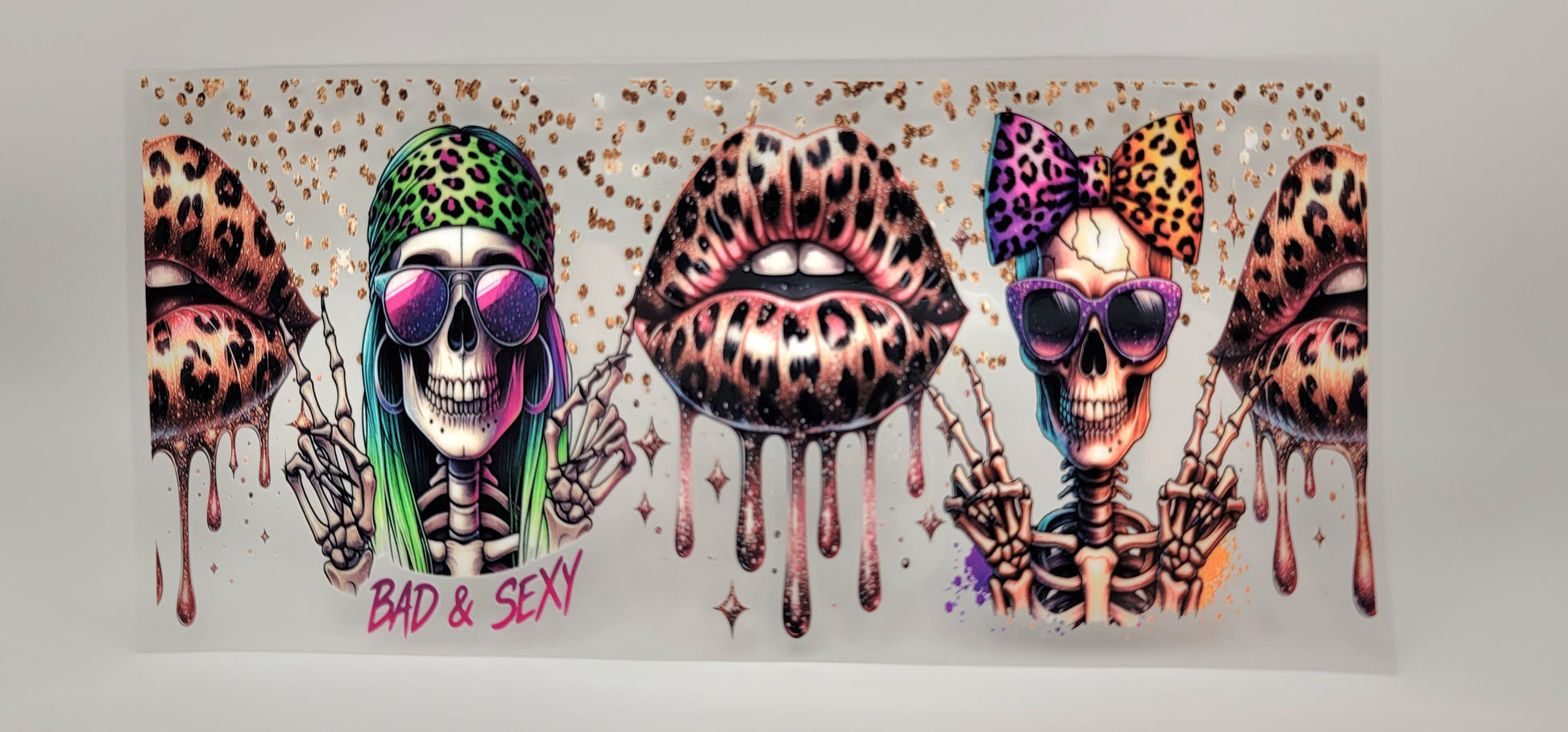 Bold dripping leopard-print lips, wild neon accents, and rebel skulls rocking shades, bows, and bandanas. A fierce mix of edgy glam and outlaw attitude, this wrap is made for those who sip with style and refuse to blend in. Perfect for bringing your tumbler to life with a fearless, glitter-soaked vibe.