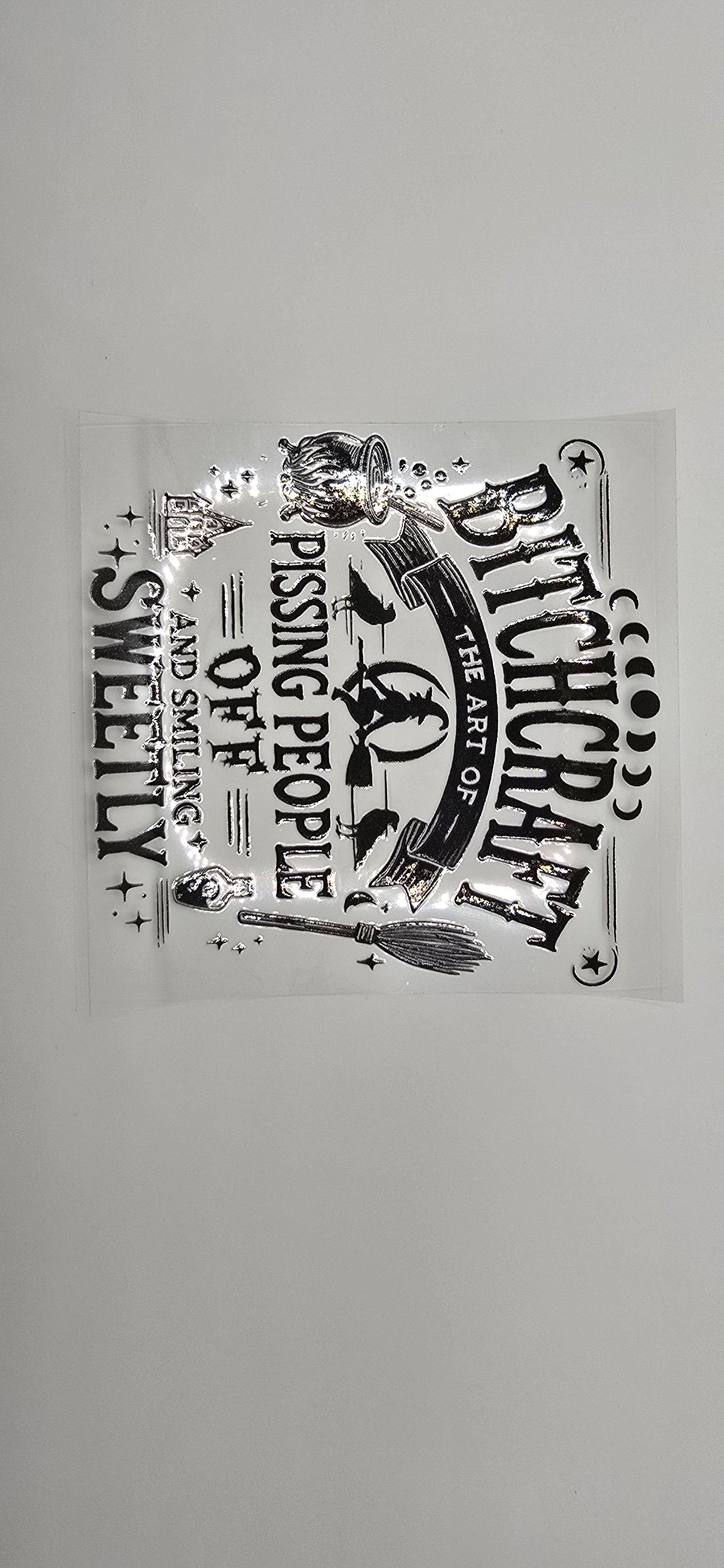 Cast a little sass with this bold Bitchcraft wrap! Featuring the phrase “The art of pissing people off and smiling sweetly” in gothic metallic lettering with witchy accents like cauldrons, brooms, moons, and stars, this design is perfect for those who love their magic with a side of attitude.