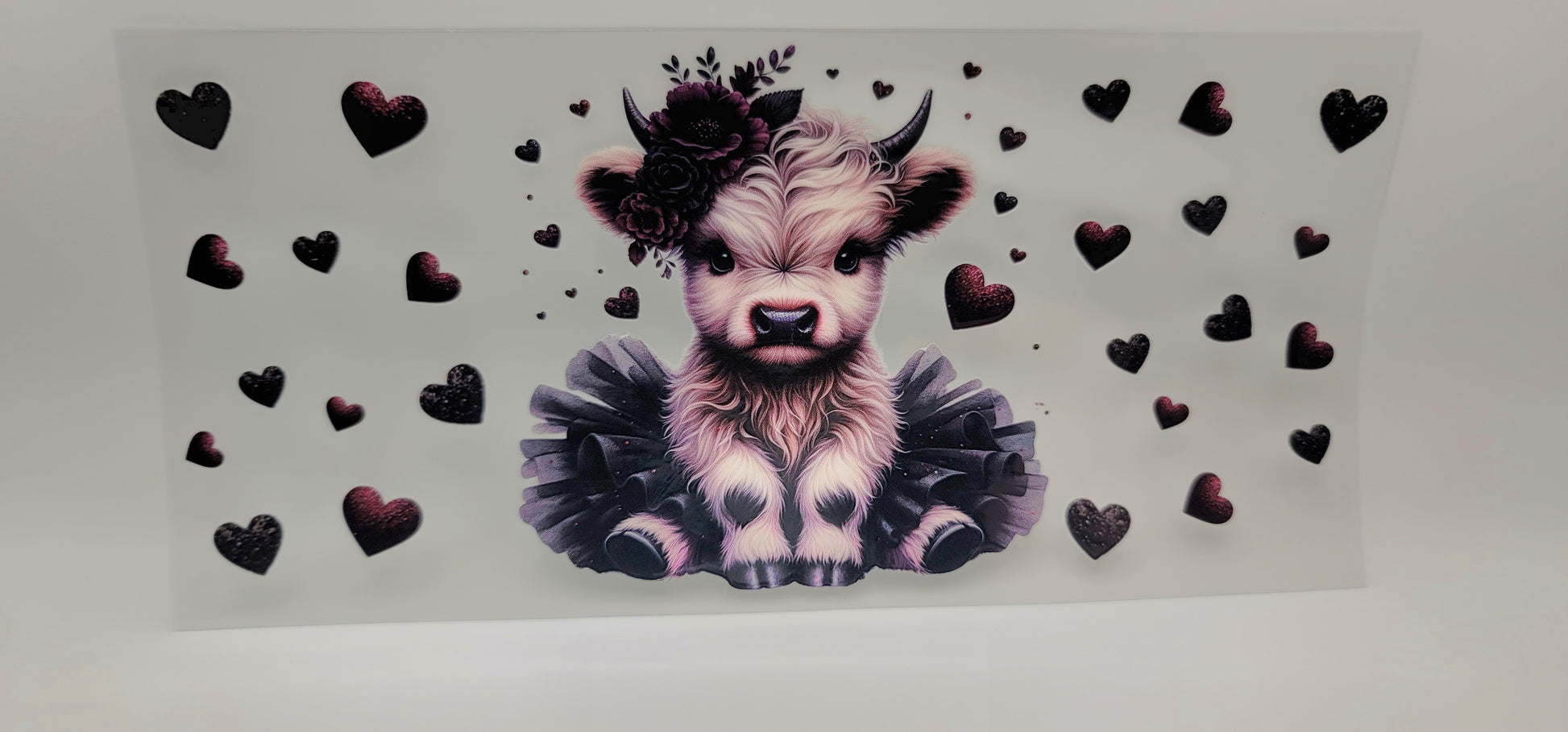 Fall in love with the Dark Romance wrap, featuring an adorable Highland cow dressed in black lace with a matching flower crown, surrounded by shimmering black and deep plum hearts. Equal parts sweet and edgy, this design is perfect for adding a touch of gothic western flair with a whole lot of charm to your tumbler.
