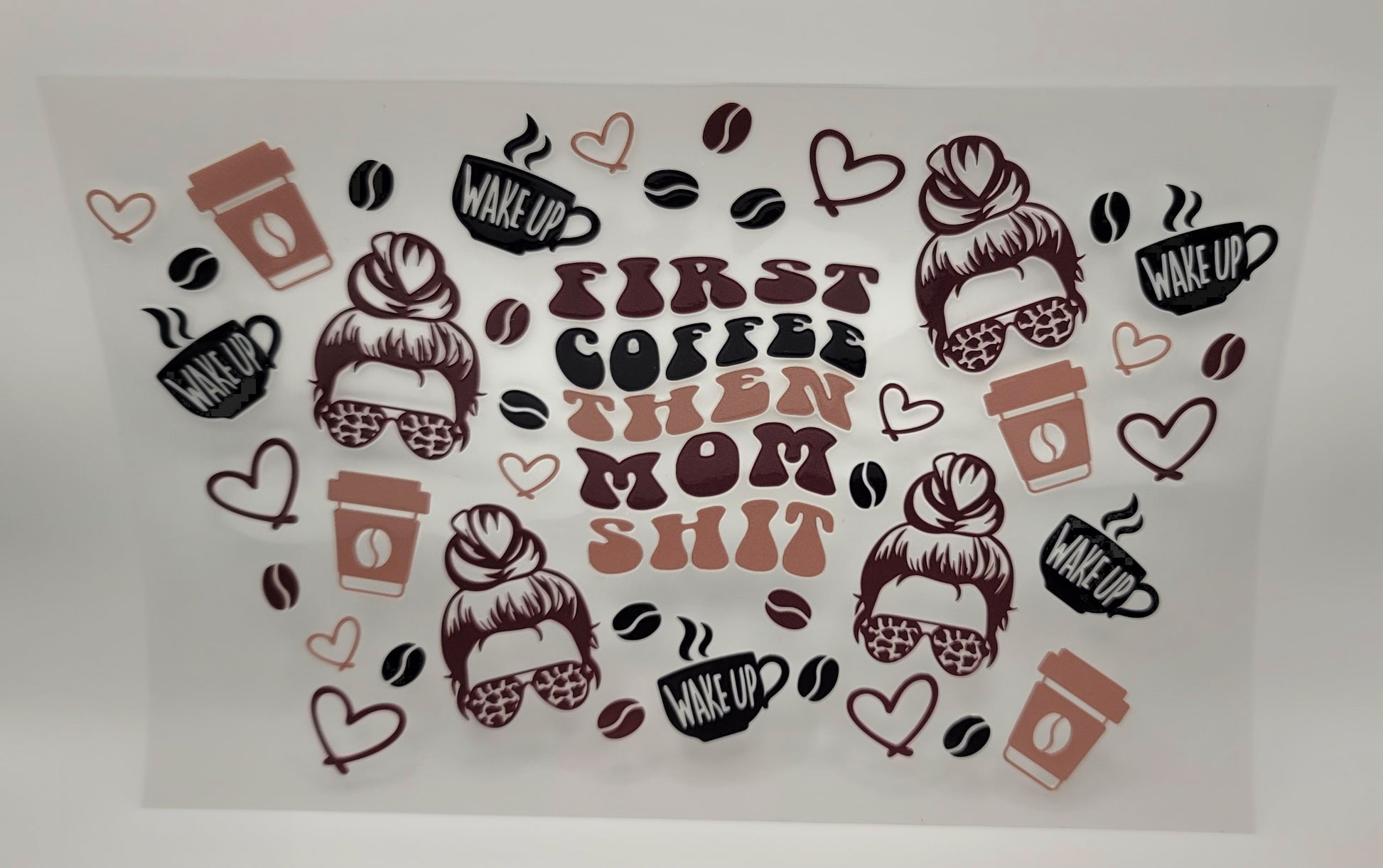 Kickstart your day with a tumbler wrap that every coffee-loving mom can relate to! This 24oz design features bold lettering that reads “First Coffee Then Mom Sht”* surrounded by steaming coffee cups, beans, hearts, and trendy messy bun mom graphics with leopard print sunglasses. The earthy browns and blacks give it that caffeine-fueled vibe, making it perfect for busy mornings and all-day energy. A fun, sassy, and relatable wrap that transforms your tumbler into your ultimate mom life essential.