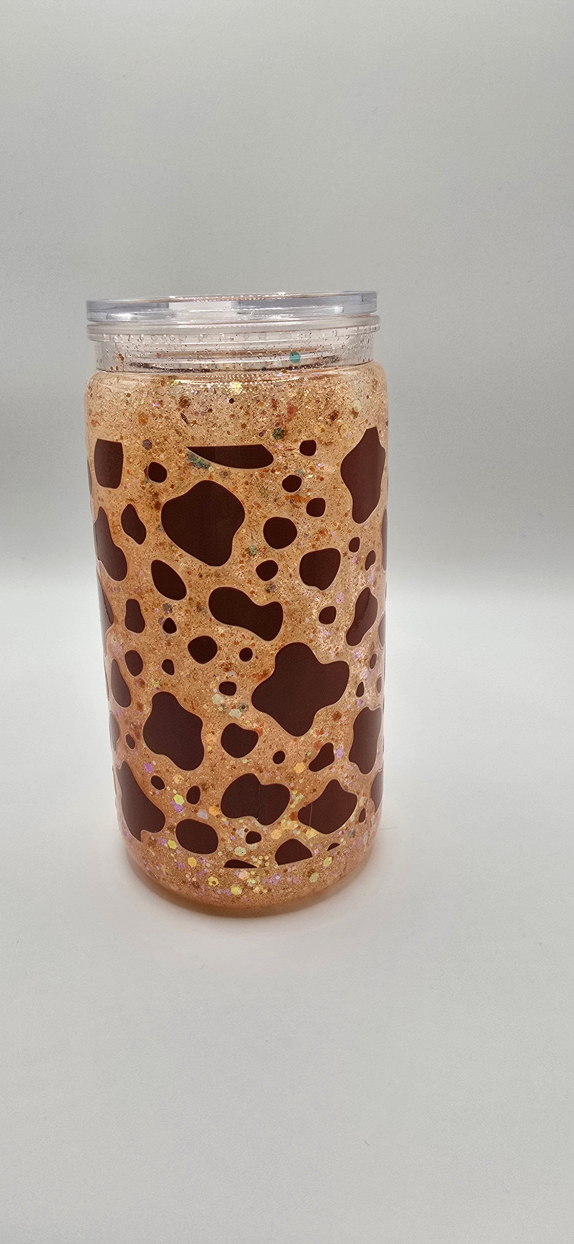 The Golden Rodeo 16oz snow globe tumbler blends rustic charm and modern sparkle — featuring a rich chocolate-brown cowhide print floating over golden, copper, and iridescent glitter. It’s smooth, earthy, and downright show-stopping, perfect for any cowgirl (or cowboy) who likes their style as bold as their coffee.