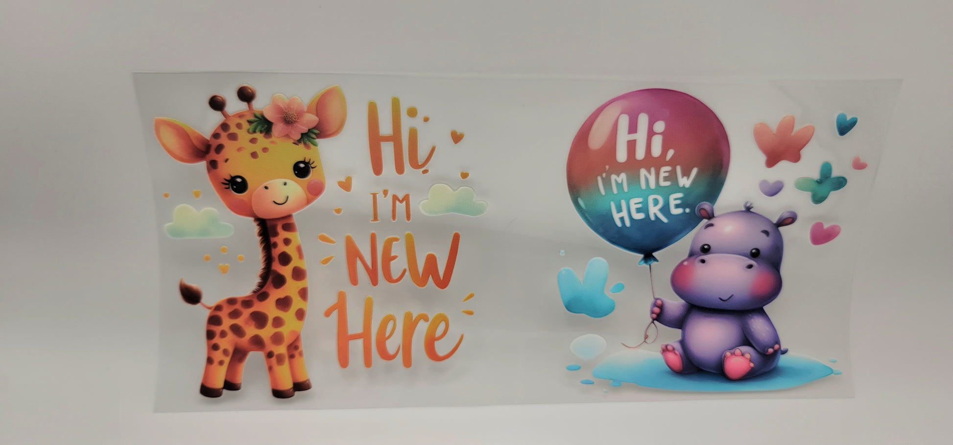 Perfect for baby gifts, announcements, or nursery vibes—this cheerful wrap features a smiling giraffe with a flower crown and an adorable hippo holding a balloon that proudly says, “Hi, I’m New Here.” Bright colors, soft pastels, and a touch of whimsy make it a heartwarming design for little ones or anyone celebrating new beginnings.
