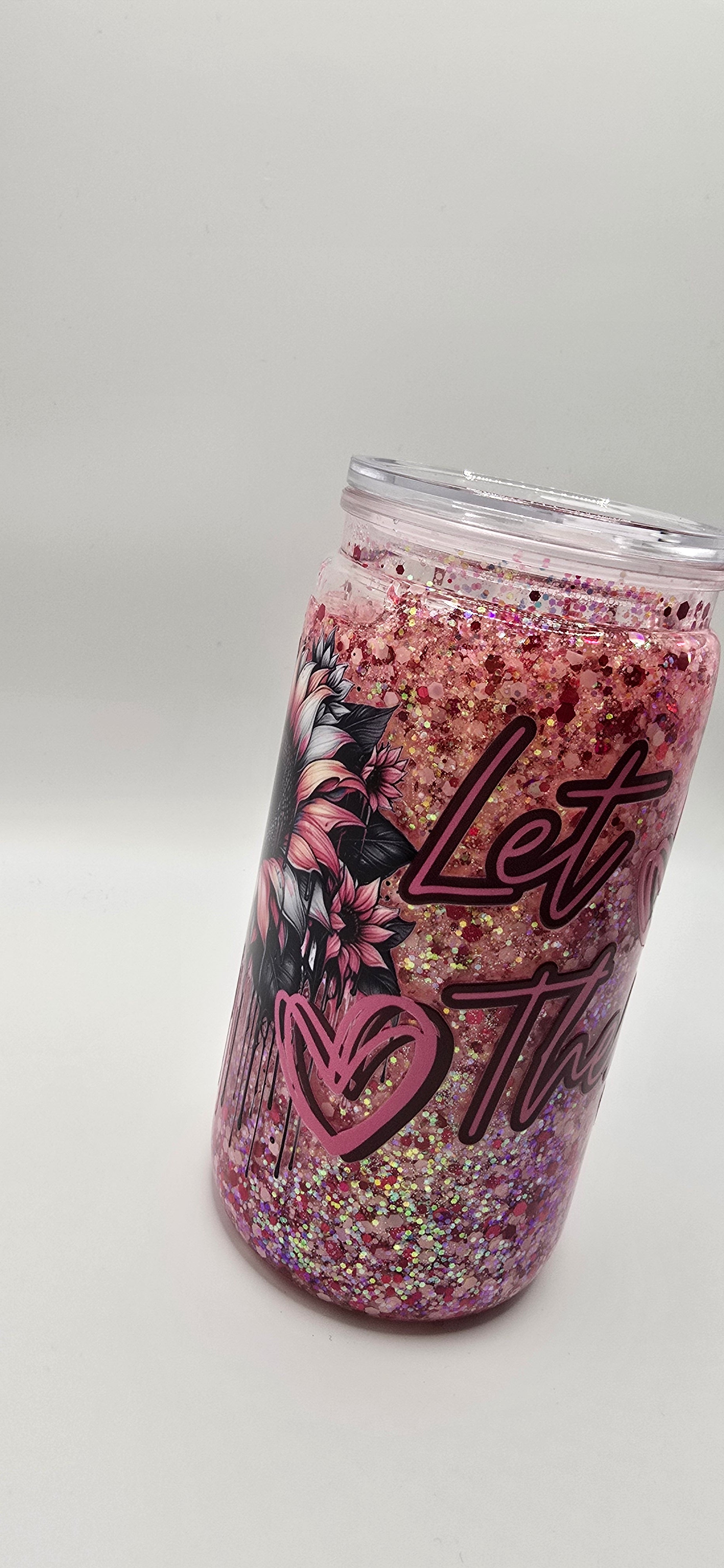 Sip with confidence and let your sparkle speak for itself ✨ The Let Them 16oz snow globe tumbler is all about self-love and letting go — featuring a fierce mix of hot pink, rose, and iridescent glitter that flows like liquid empowerment. The “Let Them” script paired with moody floral details gives this tumbler a bold feminine edge — a perfect daily reminder to stay unbothered and unapologetically you.