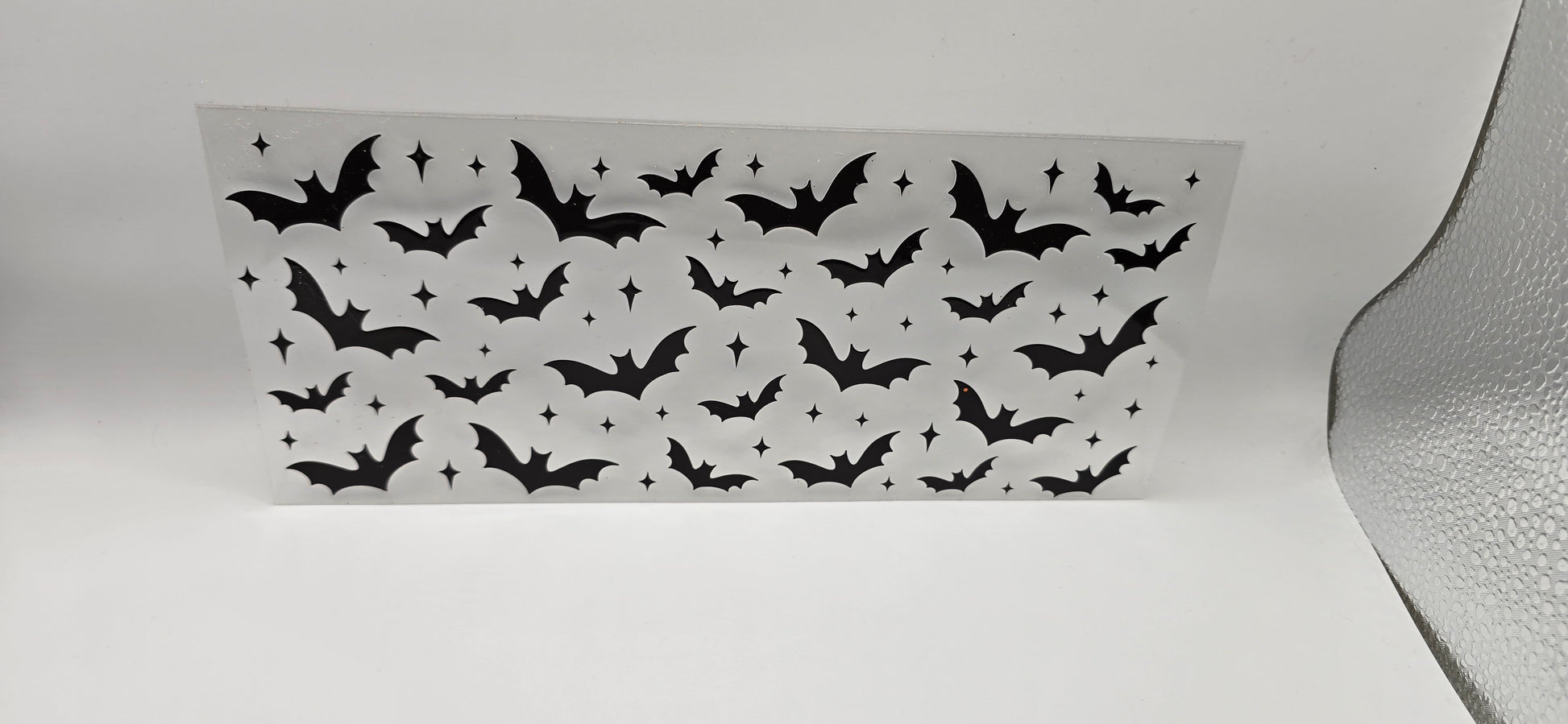 Take your tumbler to the dark side with this Midnight Flight Wrap, featuring a swarm of sleek black bats gliding across a transparent sky dotted with tiny stars. Perfect for Halloween lovers, gothic styles, or anyone who thrives in the midnight hour. This wrap pairs beautifully with dark glitter or lava bases, adding a moody, mysterious edge to your creations.