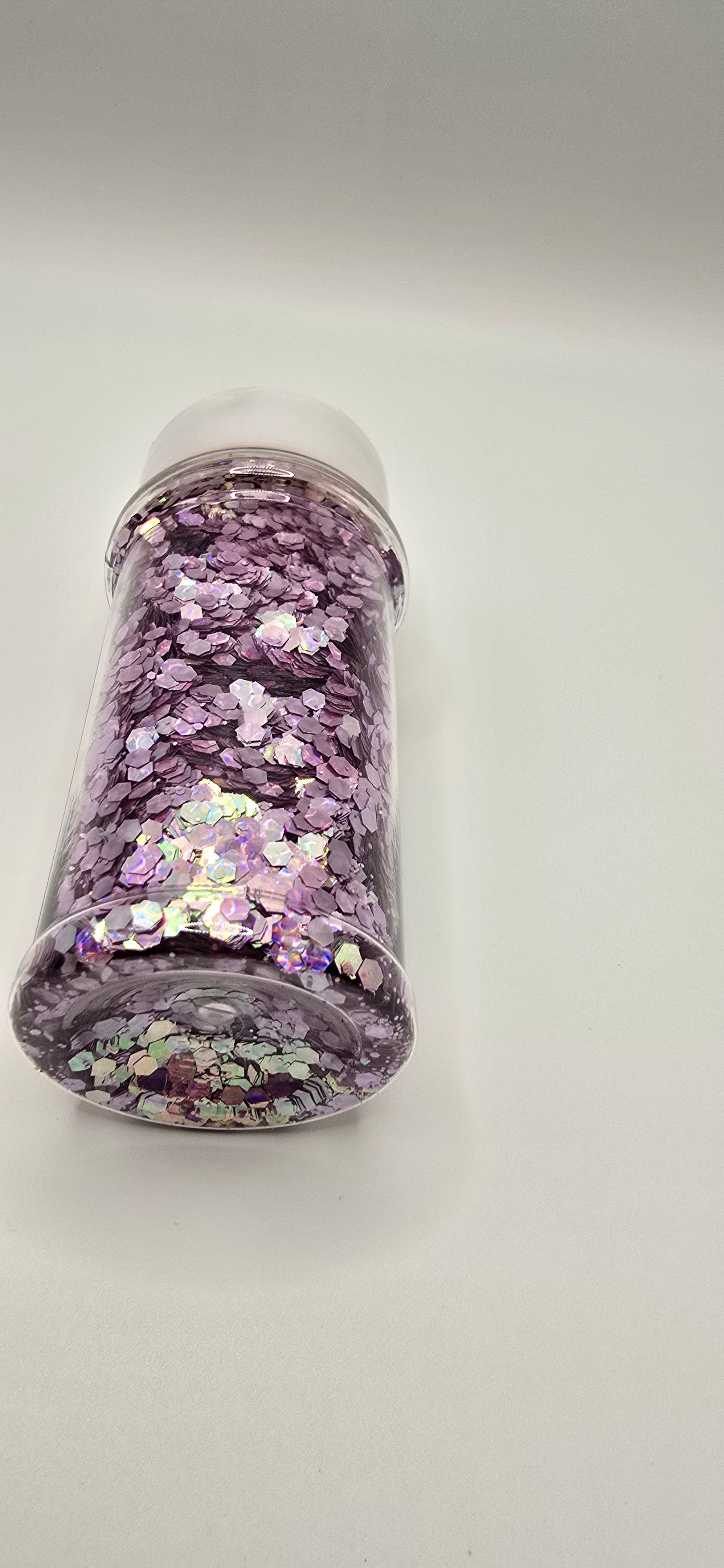 Shines like moonlight over lavender fields — a soft purple flake glitter with holographic reflections that flash pink, silver, and pale gold as it moves. This delicate yet daring mix brings a vintage, Western femininity that pairs beautifully with both dark and neutral cup tones. Perfect for adding a dreamy shimmer with just the right outlaw edge.