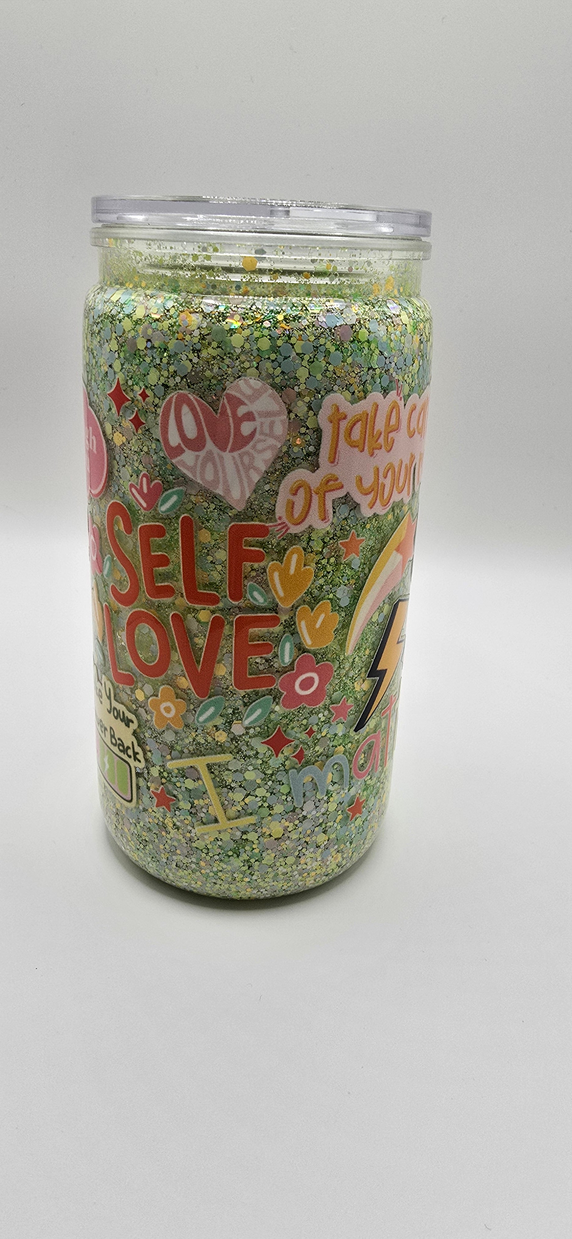 This Self Love Club 16oz snow globe tumbler is a daily reminder to take care of your heart and your mind. Its uplifting stickers — “You matter,” “Take care of yourself,” and “Love your energy” — float over a cheerful mix of lime green, yellow, and pastel glitter that sparkles like sunshine. Every shake radiates positivity and good vibes.