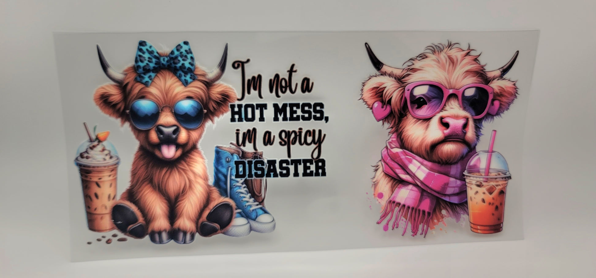 Two adorable Highland cows rocking shades, bows, and scarves alongside iced coffee vibes. With the playful phrase “I’m not a hot mess, I’m a spicy disaster”, this design is perfect for anyone who owns their chaos with style, humor, and a little caffeine.