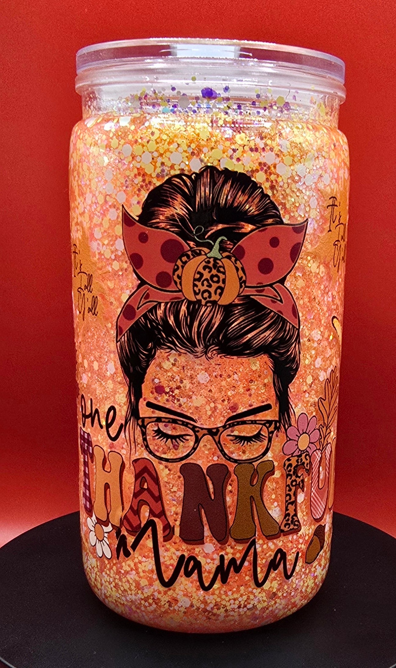 Show off your thankful mama spirit with this cozy 16oz glitter tumbler — the perfect companion for pumpkin spice mornings and sweater-weather sips.
